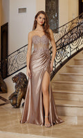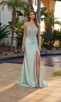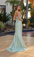 Strapless satin prom dress by Nox Anabel featuring an embroidered fitted corset bodice and a floor-length satin wrap-style skirt with a high-leg slit. This bodice has a sweetheart neckline and a midrise open back with an adjustable lace-up. The satin sheath skirt has pleating at the natural waistline to accentuate the figure. The dress finishes with an elegant sweep train to complete the elegant look.