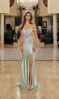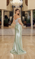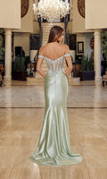 Off-the-shoulder prom dress by Nox Anabel with a luxurious shiny satin fitted sheath skirt. This dress features a sheer corset bodice with colorful floral embroidery and beadwork, a sweetheart neckline, and a v-shaped open back with a zipper closure. The satin skirt has gathering at the natural waist, a high-leg slit, and finishes in a graceful sweep train.