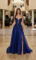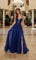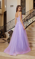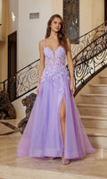 Sleeveless prom dress by Nox Anabel with a sheer floral-embroidered fitted corset bodice, a sheer plunging v-neckline, floral shoulder straps, and a v-shaped open back with a zipper closure. The intricate floral embroidery cascades down from the bodice to the waist and hips. The dress transitions to a shimmering floor-length tulle a-line skirt with a thigh-high slit and finishes with a short sweep train.