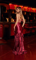 Sleeveless floor-length prom dress by Nox Anabel made of shiny luxurious satin fabric. This dress features a sparkling sequin-embellished sheer fitted corset bodice, a sweetheart neckline, thin shoulder straps, and a stylish strappy adjustable lace-up open back. The skirt features unique layered ruffles at the back hem, a daring high-leg slit, and a small sweep train for an effortlessly elegant look.