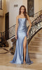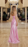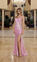 Strapless sleek and sexy satin formal dress by Nox Anabel featuring a fitted bodice with colorful sequin floral embroidery. The bodice has a straight neckline and a midrise open back with a zipper closure. The fitted sheath skirt has a dramatic high-leg side slit and finishes with a small sweep train for a classic look.