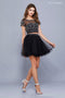 Stand out from the crowd in this two-piece short cocktail dress with a floral embroidered crop top by Nox Anabel Style Number 6272. This short cocktail dress features a halter top adorned with beautiful Southwest-style floral embroidery, sheer illusion neckline, embellished waistband, keyhole open back, short flirty skirt with ruffled edges, and a zipper closure.