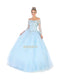 May Queen LK118: An opulent ballgown featuring a lace bodice with jewel embellishments, an illusion V-neckline, and a corset design. The full skirt cascades from the basque waist, creating a dramatic look.