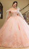 Details: Off Shoulder Sleeves, 3D Floral Appliques, Beaded, Sequin, Corset Lace-Up Back, Oversized Back Bow, Watteau Train