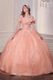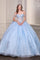 Make a stunning entrance in this Ladivine 15735 off-shoulder corset ball gown, designed to turn heads at any formal occasion. The sheer illusion sweetheart bodice features intricate embroidered appliqués and beaded details, while structured corset boning creates an elegant silhouette. An open lace-up back with zipper closure adds dramatic flair, leading to a voluminous A-line skirt with graceful train and bow accent. Crafted from luxurious tulle with glitter embellishments, this floor-length gown is fully lined and available in light blue from X-Small to 3X-Large. Perfect for quinceañeras, sweet sixteens, galas, proms, and unforgettable special occasions.