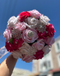 Handmade quinceañera bouquet featuring navy blue, burgundy, and ivory roses, finished with gold brooches.