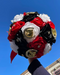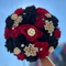 Handcrafted quinceañera bouquet featuring roses in gold and red shades. Accented with gold brooches and gold pearls. Please note that brooch styles may vary depending on availability.