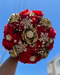 Handcrafted quinceañera bouquet featuring artificial roses in red, black, and white. Accented with gold charro brooches.