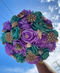Handcrafted quinceañera bouquet featuring turquoise and white roses, accented with silver brooches. Please note that brooch styles may vary depending on availability.