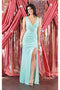 - Details: Captivate with stunning elegance in this sleeveless stretch sequin gown. The dress features a modest V-neckline with a discreet modesty piece and a graceful V-shaped back with a zipper closure. A ruched bodice and embellished natural waistline enhance your figure, while glitter and sequins add a sparkling touch. Designed with a soft cup padded insert, full lining, and a side slit for effortless movement, this gown exudes glamour.