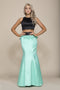 You'll love wearing this long two-piece crop top dress with floral lace top by Nox Anabel 8287. This long evening gown features a high-neck sleeveless crop-top with sheer illusion neckline, beautiful floral print lace embroidery, long luxurious satin mermaid skirt, a sexy open back, and a zipper closure.