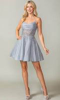 | Details: | Spaghetti Straps, Draped Bodice, Illusion Midriff, Embroidered Details, Rhinestones, Lace Up Back, Short Hem |