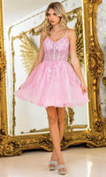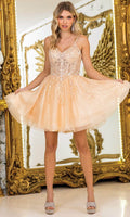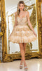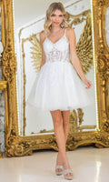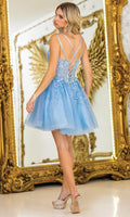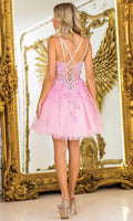 For a youthful and radiant look, choose Dancing Queen 3415. The dual spaghetti straps and sweetheart neckline are complemented by a beaded and floral embroidered bodice that catches the light beautifully. A glittery tulle A-line skirt offers playful volume, while the lace-up back ensures the dress hugs perfectly to your figure. This Dancing Queen 3415 short dress is a charming option for dances, parties, or special occasions where you want to stand out. Models are wearing Bahama Blue, Champagne, Off White, and Pink colors.