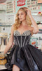 This strapless short homecoming dress by Nox Anabel exudes effortless allure with its vibrant multicolor sequin floral design extending from the deep v-neckline to the hem. Featuring a corset-style bodice that contours the back and a mini skirt that flatters the hips, this sequin cocktail dress is perfect for homecoming, weddings, and semi-formal occasions. Offering red-carpet glamour at an accessible price under $200, it combines bold style with sophisticated craftsmanship.