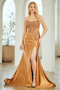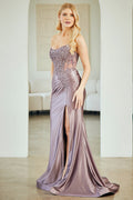 Make a stunning entrance in this exquisite strapless gown by Amelia Couture 8059, featuring intricate beaded appliqués and embroidered details that catch the light beautifully. The structured bodice showcases an illusion scoop neckline with corset boning for a flattering silhouette, while the open lace-up back adds an alluring touch of elegance. A floor-length fitted skirt with dramatic side slit and train creates movement and sophistication. Crafted from luxurious satin with beaded embellishments and fully lined for comfort, this gown transitions effortlessly from prom to galas, red carpet events, and formal occasions. Available in five stunning shades—Gold, Navy Blue, Mauve, Periwinkle, and Victorian Purple—in sizes 0-14.