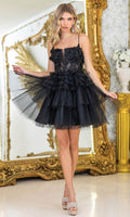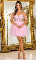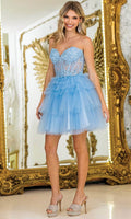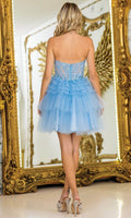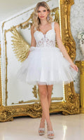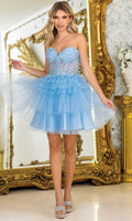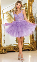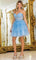 Make a statement in the fun and fabulous Dancing Queen 3402. This short A-line party dress features a tiered ruffle skirt that sways effortlessly as you move. The sheer bodice and plunging sweetheart is adorned with intricate beaded and floral embroidery, while the stylish wide straps can be worn over the shoulder or off the shoulder. The natural waistline cinches the silhouette, offering a flattering shape. Perfect for cocktail parties or birthdays, Dancing Queen 3402 will have you feeling glamorous, youthful, and ready to celebrate in . Models are wearing Bahama Blue, Champagne, Lilac, Off White, Pink, Red, and Silver colors.