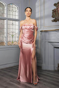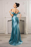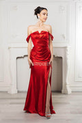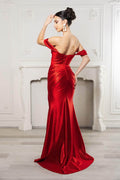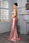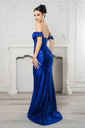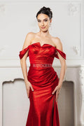 For a look that sparkles with every step, this May Queen MQ2155 gown is a must-have for glamorous nights. The ensemble features a glitter satin fabric with a ruched bodice, draped cap sleeves and romantic off shoulder v-neckline. The high slit brings a bold finish to this sheath silhouette, making it ideal for galas or red carpet moments. The May Queen MQ2155 ensures that you will shimmer with confidence and elegance all night long. Models are wearing Black, Red, Rosegold, Royal, and Seamist colors.