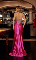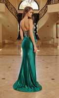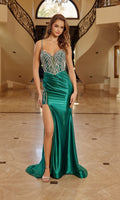 Long sleeveless prom dress by Nox Anabel with a beaded embellished sheer corset bodice and a smooth shiny satin fitted sheath floor-length skirt. This dress features thin beaded shoulder straps, an adjustable lace-up open back, a dramatic high-leg side slit, and a sweep train.