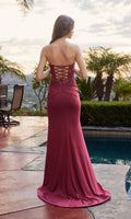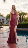 Strapless floor-length prom dress by Nox Anabel adorned with intricate 3D floral-lace appliques and scattered sequins from the neckline and cascading down to the hips. This design features a sheer-embroidered fitted corset bodice with a sweetheart neckline and an adjustable lace-up open back. The fitted stretch jersey skirt hugs the curves and flows to the floor with a high-leg side slit for an overall elegant look.