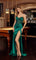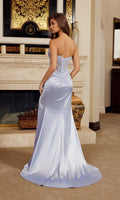 Shiny satin strapless floor-length prom dress by Nox Anabel featuring a fitted embroidered corset bodice with a pleated bust, a sweetheart neckline, and a midrise open back with a zipper closure. The dress transitions to an elegant wrap-style shiny satin skirt with a dramatic high-leg slit and graceful sweep train.